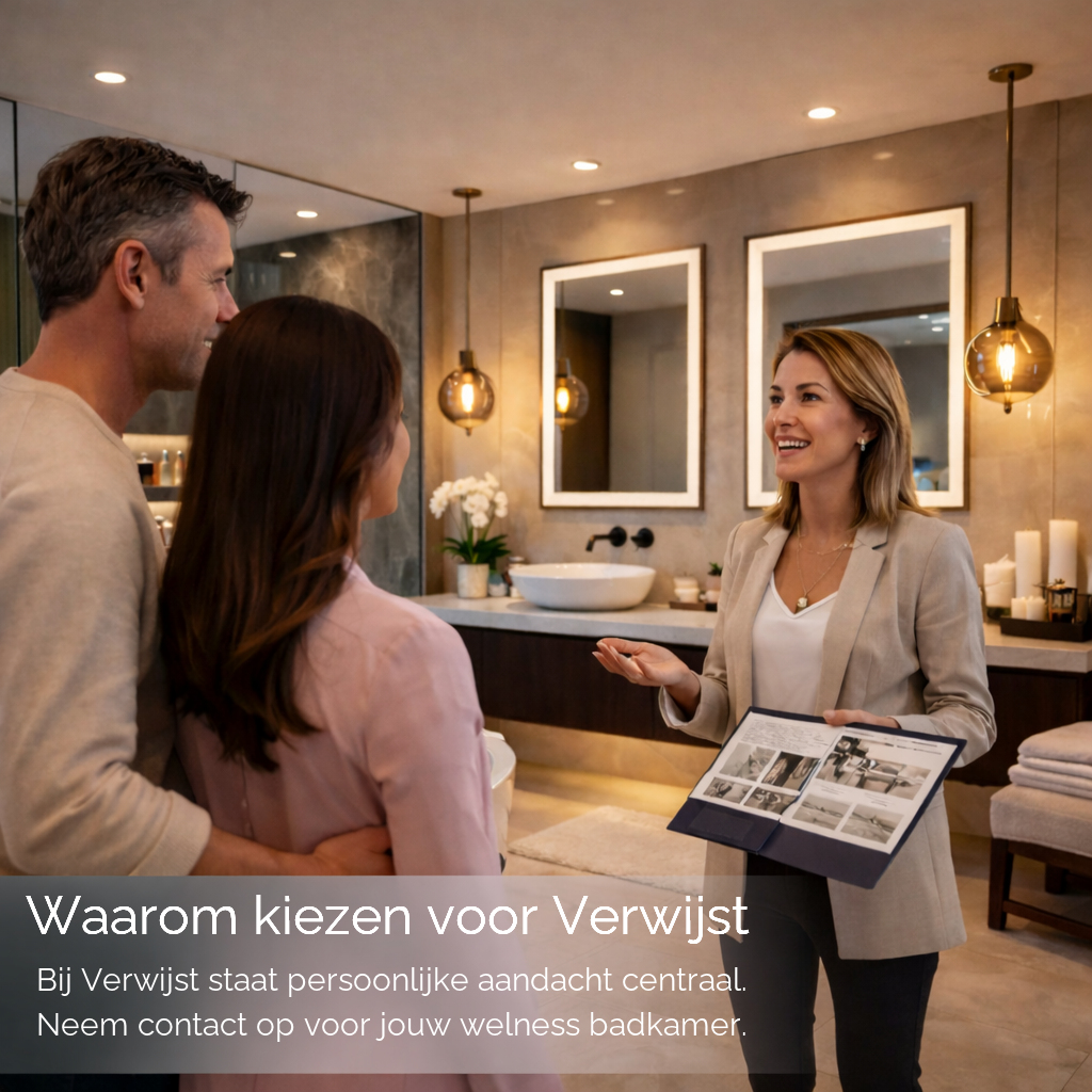 Bij Verwijst geloven we dat een wellness badkamer volledig moet aansluiten bij jouw woonstijl en levensritme. Of u nu houdt van een moderne badkamer met strakke lijnen, of juist een warme en rustige uitstraling zoekt, wij vertalen jouw wensen naar een ontspannen totaalbeleving. Een wellness badkamer draait om comfort, sfeer en slimme oplossingen. Het is de plek waar je even ontsnapt aan de drukte van de dag. Verwijst helpt u om van uw badkamer een persoonlijke wellnessruimte te maken.